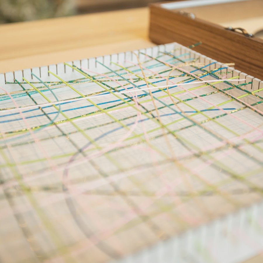 お好きな色の水引を一人1本、受け皿の溝につないでもらいます。